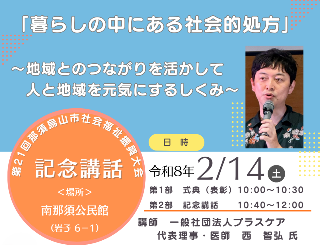 | ◇内容 | 第1部 式典(社会福祉事業功労者表彰・感謝状贈呈) 第2部 記念講話 演題:「暮らしの中にある社会的処方」 ~地域とのつながりを活かして人と地域を元気にするしくみ~ 講師 一般社団法人プラスケア 代表理事・医師 西 智弘 氏 |